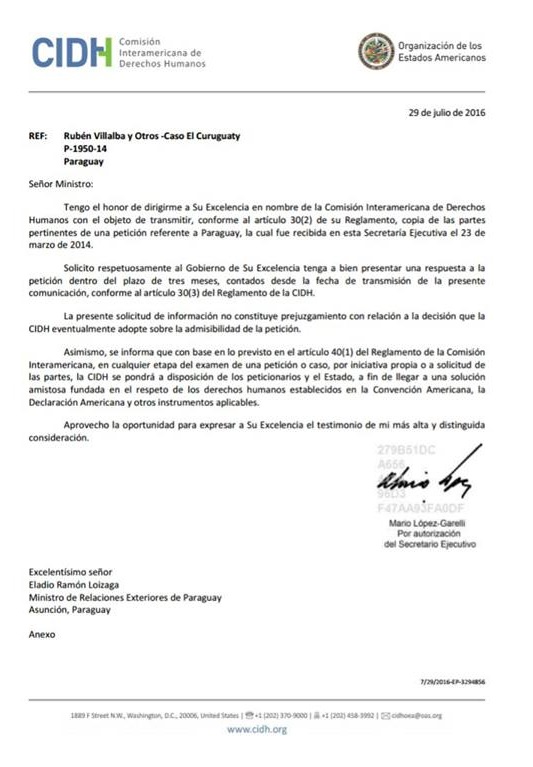 El Estado paraguayo tiene 3 meses de plazo desde el pasado 29 de julio para responder a la Comisión Interamericana de Derechos Humanos (CIDH) por el conocido como Caso Curuguaty.